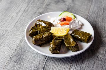 Grape leaves stuffed and hand-rolled with seasoned rice, tomatoes, and fresh garden herbs served with tzatziki and a lemon wedge. Served cold or warm.