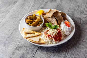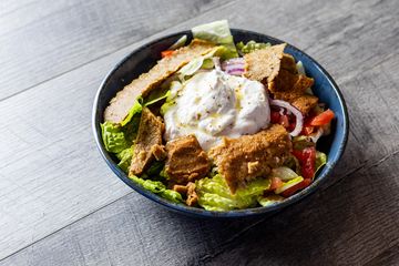 Your choice of lamb, chicken, falafel, or hummus, rice, lettuce, tomato, onion, tzatziki, and house-made Greek dressing served with warm pita.
