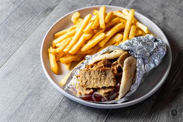 Wrapped in pita bread with lettuce, tomatoes, red onions and tzatziki.