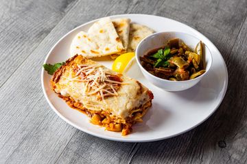 Pasta layered with our house-made meat sauce, topped with a savory bechamel sauce & parmesan, served with stewed green beans, and warm pita.