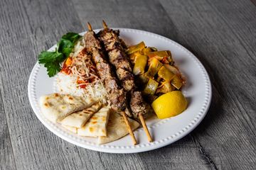 Two skewers with rice pilaf, green beans, tzatziki, and served with warm pita.