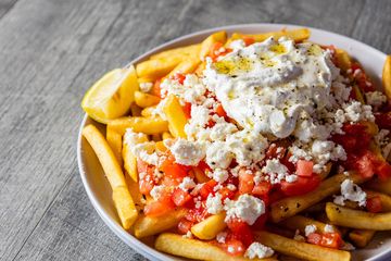 Crispy fries topped with tzatziki, chopped tomatoes, feta cheese, and house dressing.