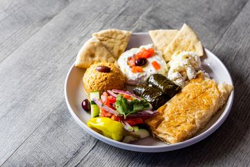 Spanakopita or tiropita, dolmades, melitzanosalata, hummus, tzatziki, tomato, cucumber & red onion salad, pepperoncini, feta, kalamata olives, served with warm pita.