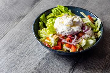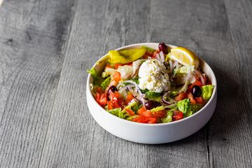 Mixed lettuce topped with tomatoes, cucumbers, red onions, green peppers, feta, kalamata olives, and pepperoncini, served with warm pita.