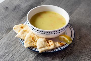 Cup of Avgolemono soup and side of Greek salad, served with warm pita.